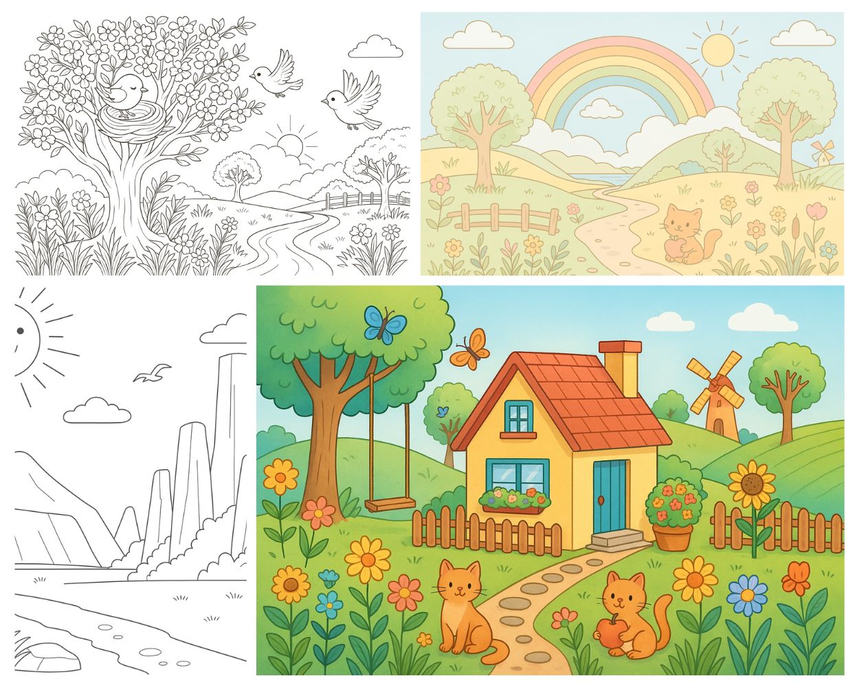 画面温馨、线条清晰,充满小屋、花园、森林、果园、小动物和彩虹山丘等治愈场景,适合孩子在愉快的氛围中自由涂色、发挥想象。每一幅画都保留了适当留白,便于创意填色,也可作为亲子互动、幼儿园课堂、绘画启蒙或情绪放松练习使用。
