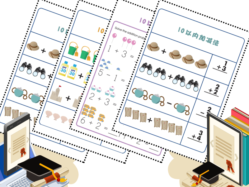 练习形式由浅入深,包含:点数 → 看图加减 → 竖式口算 → 混合练习,难度自然过渡,不会给孩子造成压力。