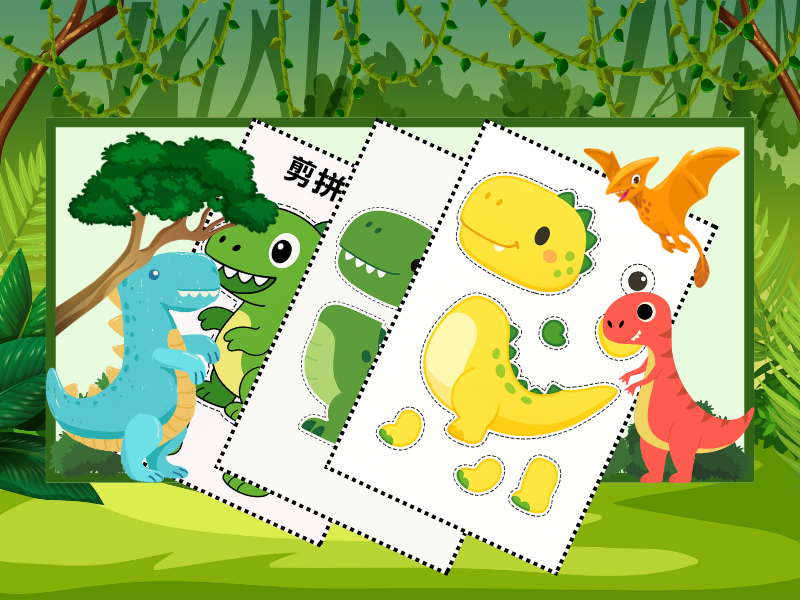 沿着虚线慢慢剪下恐龙的头、身体、手、脚、眼睛等部分。